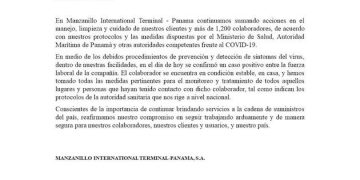 Read moreDetailsRedacción snip@noticiadepanama.com EL Puerto Manzanillo Internacional Terminal informó que en su fuerza laboral se dio un caso positivo de COVID 19, y que se siguieron los protocolos de salud...