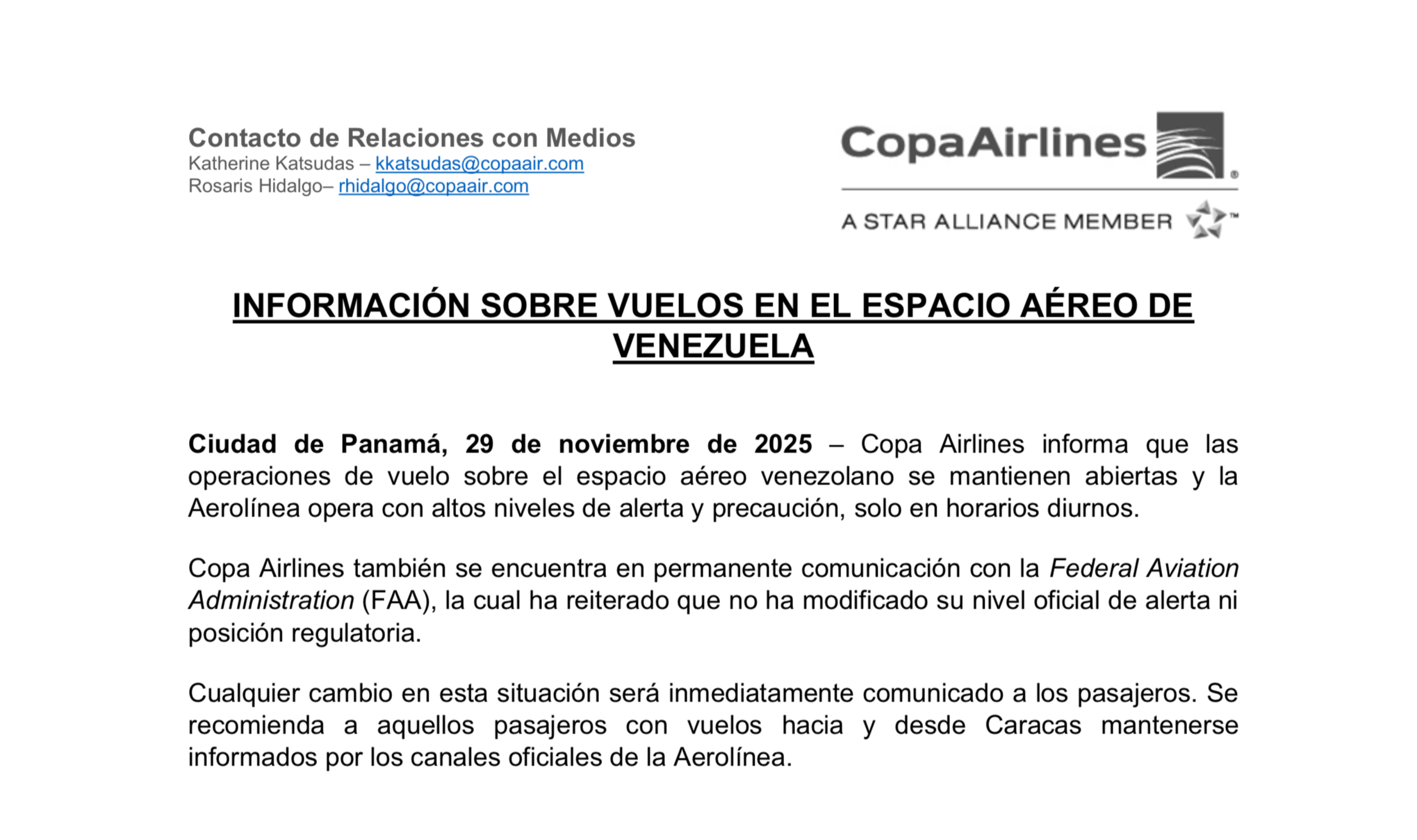 También indicaron que Copa Airlines también se encuentra en permanente comunicación con la Federal Aviation (FAA), la cual ha reiterado que no ha modificado su nivel oficial de alerta ni posición regulatoria.