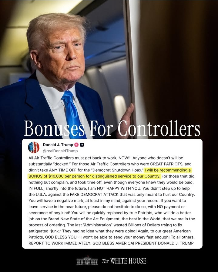 Tras el anuncio del acuerdo, el presidente Donald Trump llamó a los controladores aéreos a reincorporarse de inmediato a sus puestos de trabajo. En un mensaje publicado en su red social, escribió: “Todos los controladores aéreos deben volver al trabajo, ¡ahora! Cualquiera que no lo haga será sancionado con una reducción sustancial de salario”. Agregó que propondrá un bono de US$10.000 por persona “para aquellos grandes patriotas que no se ausentaron durante el cierre y que prestaron un servicio distinguido al país”.