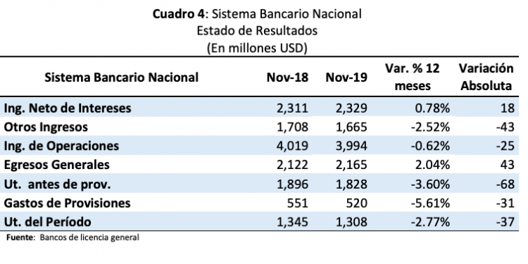 De acuerdo al Informe de la Actividad Bancaria de la Superintendencia de Bancos de Panamá, del mes de noviembre, la utilidad neta de los bancos que forman el Sistema Bancario Nacional (solo licencia general) habían caído 2,77% en relación al mismo período , pasando de US$1,345 millones a US$1,308 millones.