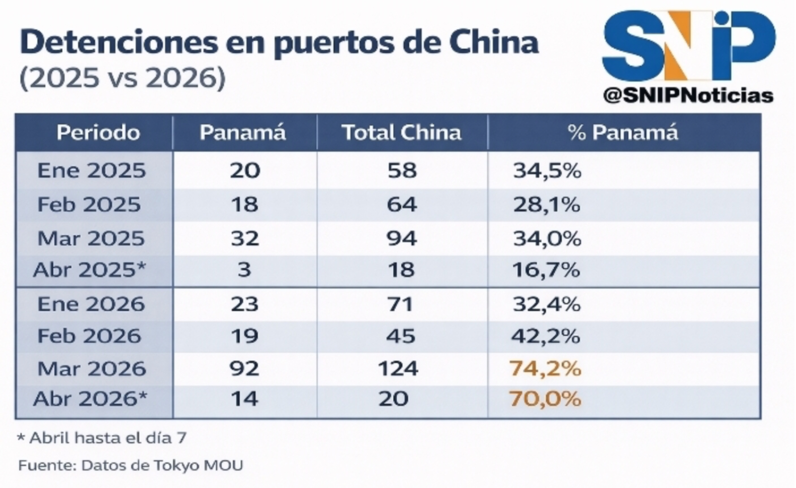 Entre marzo y los primeros siete días de abril de 2026, los puertos de China registraron 144 detenciones de buques, de las cuales 106 correspondieron a embarcaciones con bandera panameña esto representa el 73% .
