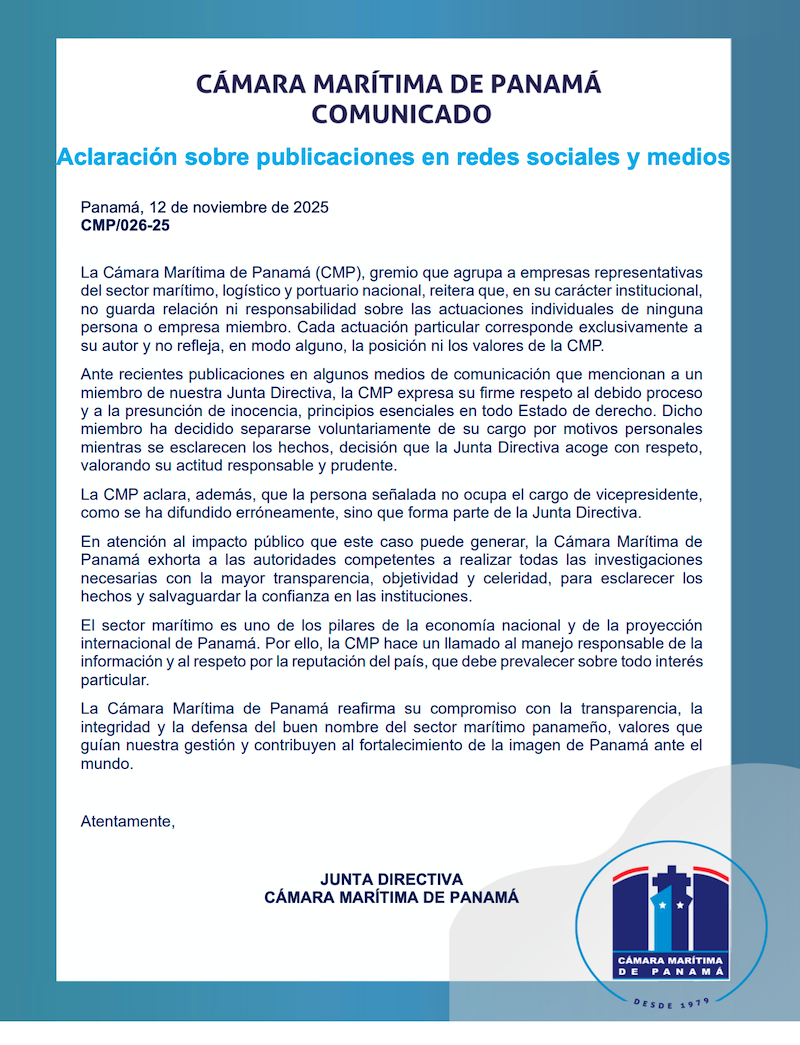 La Cámara Marítima de Panamá informó que no mantiene ningún tipo de vinculación con el tema que ha generado consultas recientes, según señaló en un comunicado dirigido al sector y a la opinión pública. La organización precisó que no guarda relación ni responsabilidad sobre las actuaciones individuales de ninguna persona o empresa miembro. «Cada actuación particular corresponde exclusivamente a su autor y no refleja, en modo alguno, la posición ni los valores de la CMP.» indicaron