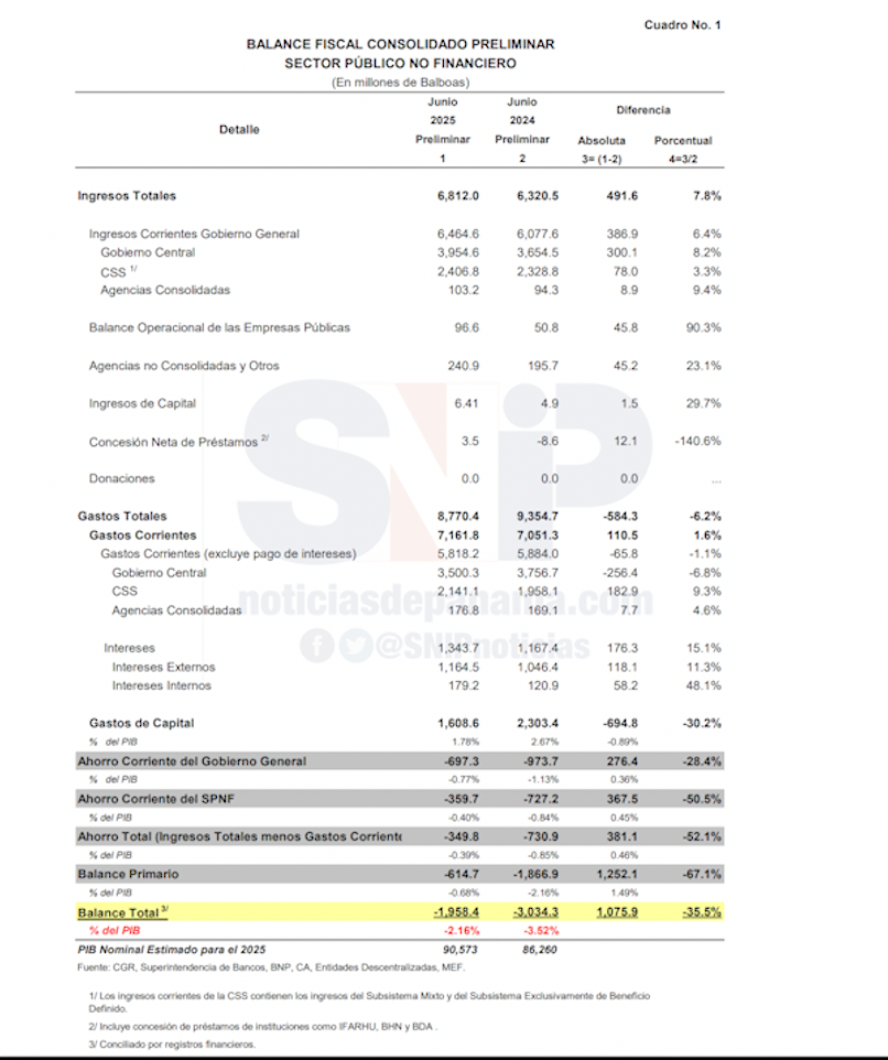 El déficit fiscal del sector Público No Financiero (SPNF) del gobierno de Panamá al primer semestre de 2025 se ubicó en 1,958.4 millones de dólares, equivalente al 2,16% del PIB, según el Balance Fiscal Consolidado Preliminar publicado por el Ministerio de Economía y Finanzas. La cifra representa una mejora frente a los 3,034.3 millones registrados en el mismo periodo de 2024, cuando el déficit fue de 3.52% del PIB.