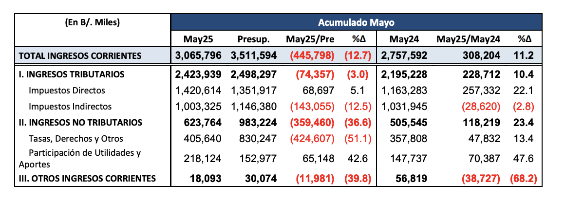 Los ingresos totales ascendieron a 6,812 millones de dólares, con un crecimiento de 7.8% frente al primer semestre de 2024. El gobierno central aportó 3,954.6 millones, un aumento de 8.2%, mientras que la Caja de Seguro Social reportó 2,406.8 millones, un alza de 3.3%. También se reflejó un incremento de 90.3% en el balance operacional de las empresas públicas.
