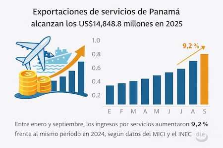 Panamá cerró los primeros nueve meses de 2025 con el mayor nivel de exportaciones de servicios registrado hasta ahora, al totalizar US$14,848.8 millones, lo que representa un crecimiento de 9.2 % frente al mismo período de 2024, según cifras de la Oficina de Inteligencia Comercial (INTELCOM) del Ministerio de Comercio e Industrias (MICI), con base en datos del Instituto Nacional de Estadística y Censo (INEC).