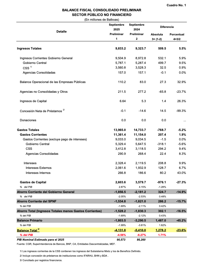 El balance fiscal del Sector Público No Financiero (SPNF) al cierre del tercer trimestre de 2025 confirma que los ingresos siguen sin alcanzar para cubrir los gastos. Según el informe del Ministerio de Economía y Finanzas, el país registró ingresos por US$9,833.2 millones frente a gastos por US$13,965 millones, dejando una diferencia de US$4,131.8 millones, que es el déficit acumulado a septiembre.