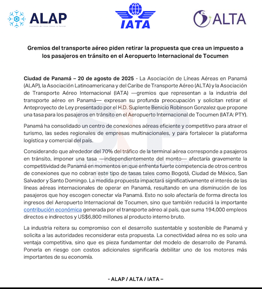 La Asociación de Líneas Aéreas en Panamá (ALAP), la Asociación Latinoamericana y del Caribe de Transporte Aéreo (ALTA) y la Asociación de Transporte Aéreo Internacional (IATA) expresaron preocupación por la iniciativa presentada por el diputado suplente Benicio Robinson González.