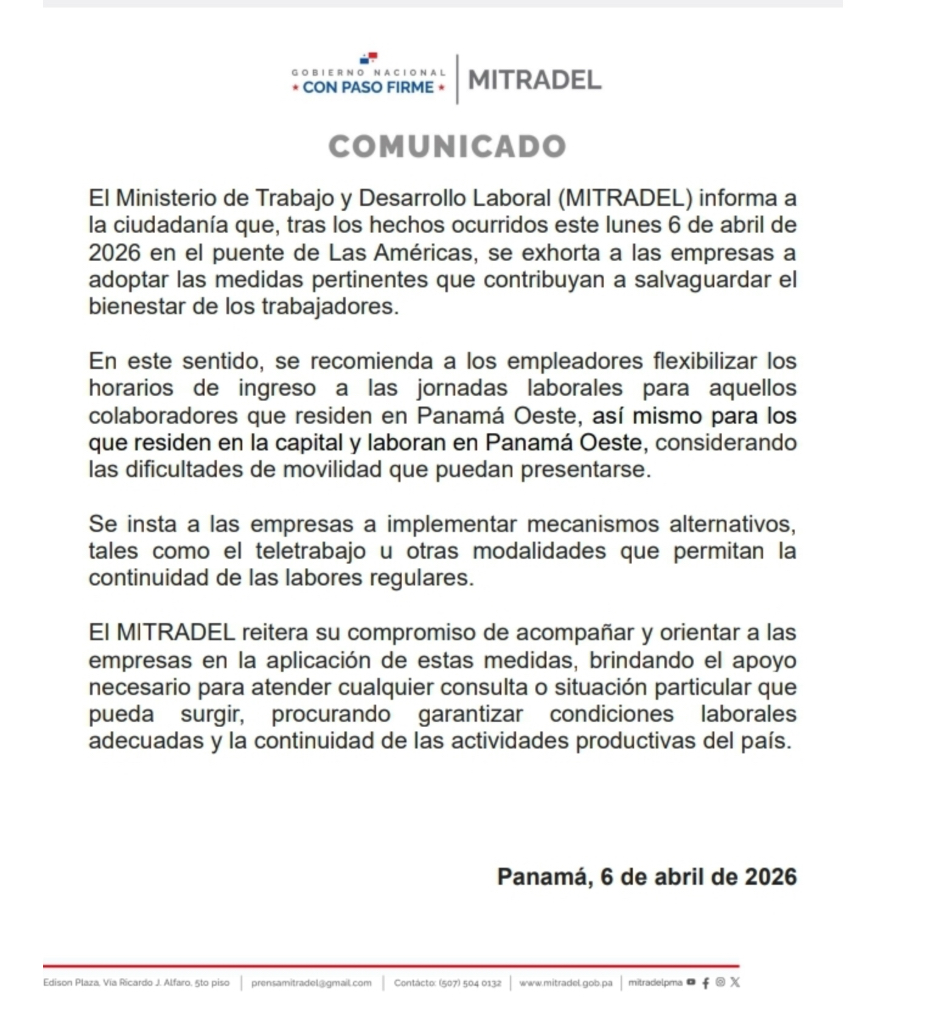 El Ministerio de Trabajo y Desarrollo Laboral informó que, tras los hechos ocurridos este lunes 6 de abril de 2026 en el Puente de las Américas, se exhorta a las empresas a adoptar medidas que contribuyan a salvaguardar el bienestar de los trabajadores.
