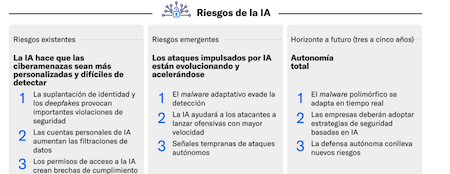 Ataques con IA: la IA amplifica técnicas existentes y acelera campañas automatizadas y malware adaptativo.