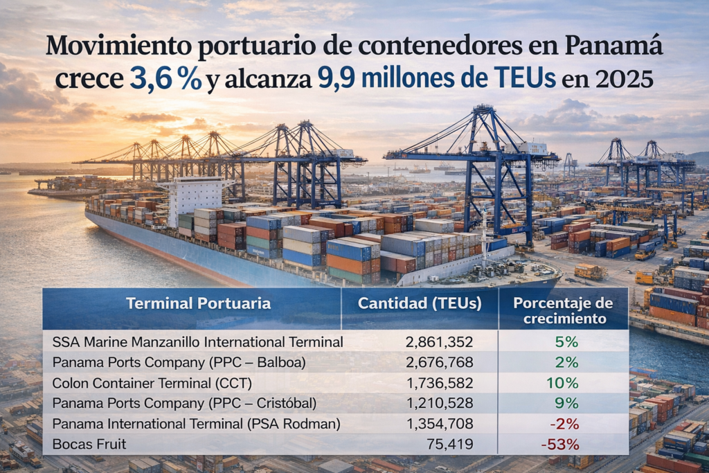 El movimiento portuario de contenedores en Panamá registró un crecimiento de 3.6 % en 2025, al movilizar 9.9 millones de TEUs, en comparación con el año anterior, de acuerdo con cifras oficiales del sistema portuario nacional.