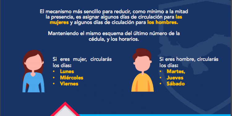 Las mujeres podrán salir los lunes, miércoles y viernes y los hombres martes, jueves y sábado. Los domingos todos en casas. Se mantiene el sistema de horarios por medio del último número de la cédula.