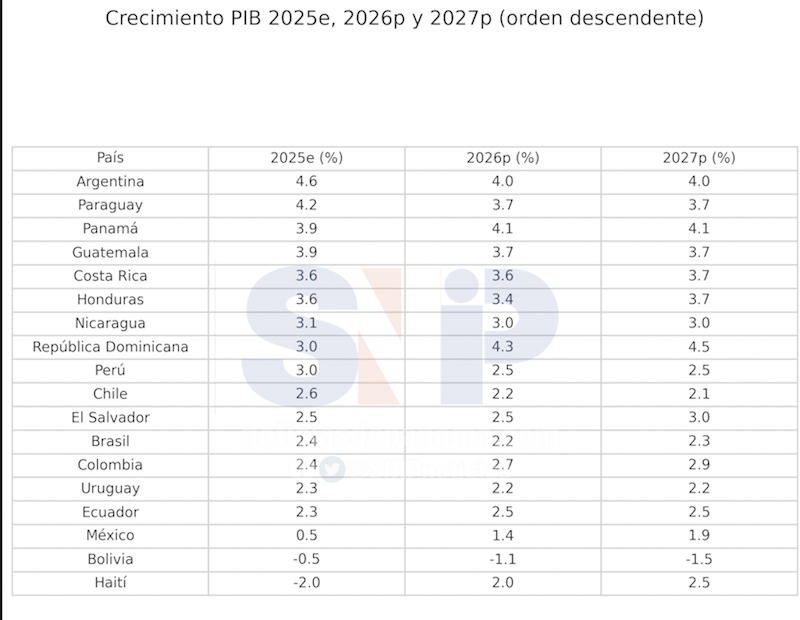 Al observar el período 2026-2027, República Dominicana destaca al proyectar una aceleración desde 3.0 % en 2025 hasta 4.5 % en 2027. Panamá se mantendría en 4.1 %, estable pero en el rango superior de la región. Paraguay sostendría un 4.2 % constante hasta 2027, mientras que Argentina, tras su fuerte recuperación en 2025, descendería a 4.0 % en 2027. Costa Rica y Guatemala continuarían alrededor de 3.6 % y 3.7 %, respectivamente, mientras que Brasil y México permanecerían por debajo de 3 %.