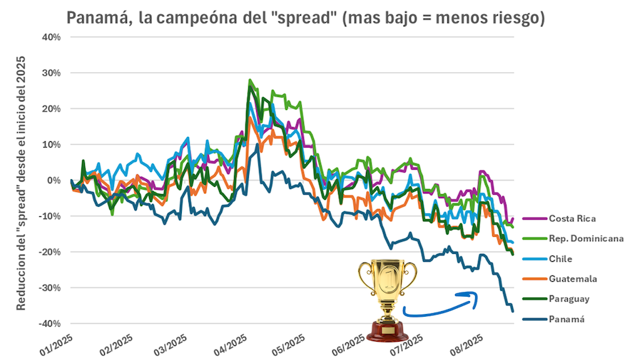 Entre los bonos de la región, los de Panamá han brillado últimamente: su “spread” (la diferencia en rendimientos frente a los bonos de EE. UU.) se ha reducido más que el de sus pares. En simple: el mercado percibe menos riesgo, así que acepta menos intereses… lo que significa que Panamá puede endeudarse más barato.