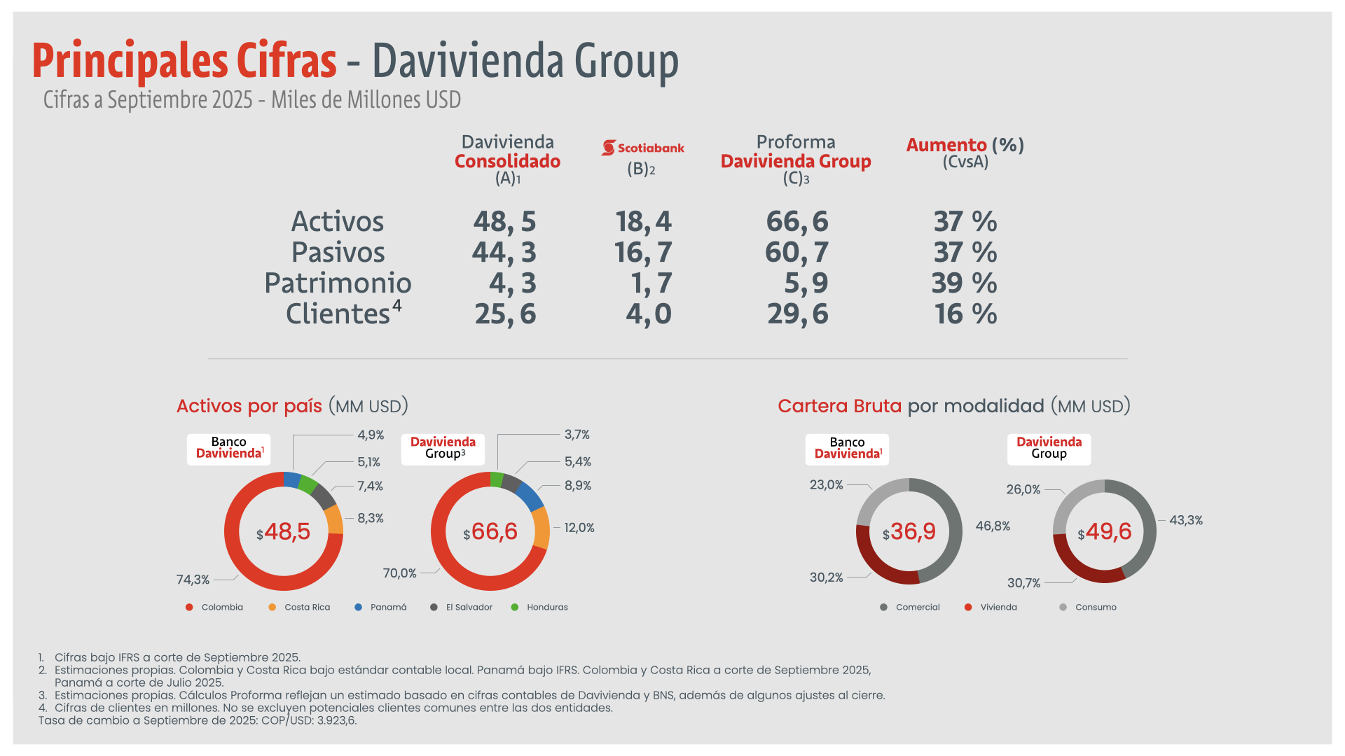 El aumento en relevancia está respaldado por la nueva escala. La operación combinada a nivel regional, lo que era Scotiabank y lo que aporta Davivienda suma aproximadamente US$5.000 millones en activos y unos US$3.500 millones en cartera, además de una fuerza laboral cercana a 900 personas. A nivel consolidado, los activos proforma alcanzan US$66.600 millones, con un crecimiento de 37% y una base superior a 29,6 millones de clientes.