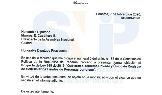 Este jueves 20 de febrero, a Asamblea Nacional aprobó nuevamente el Proyecto de Ley 169 de 2019, «Que crea el Sistema Privado y Único de Registro de Beneficiarios Finales de Personas Jurídicas» con cambios solicitados por un veto parcial del Organo Ejecutivo.