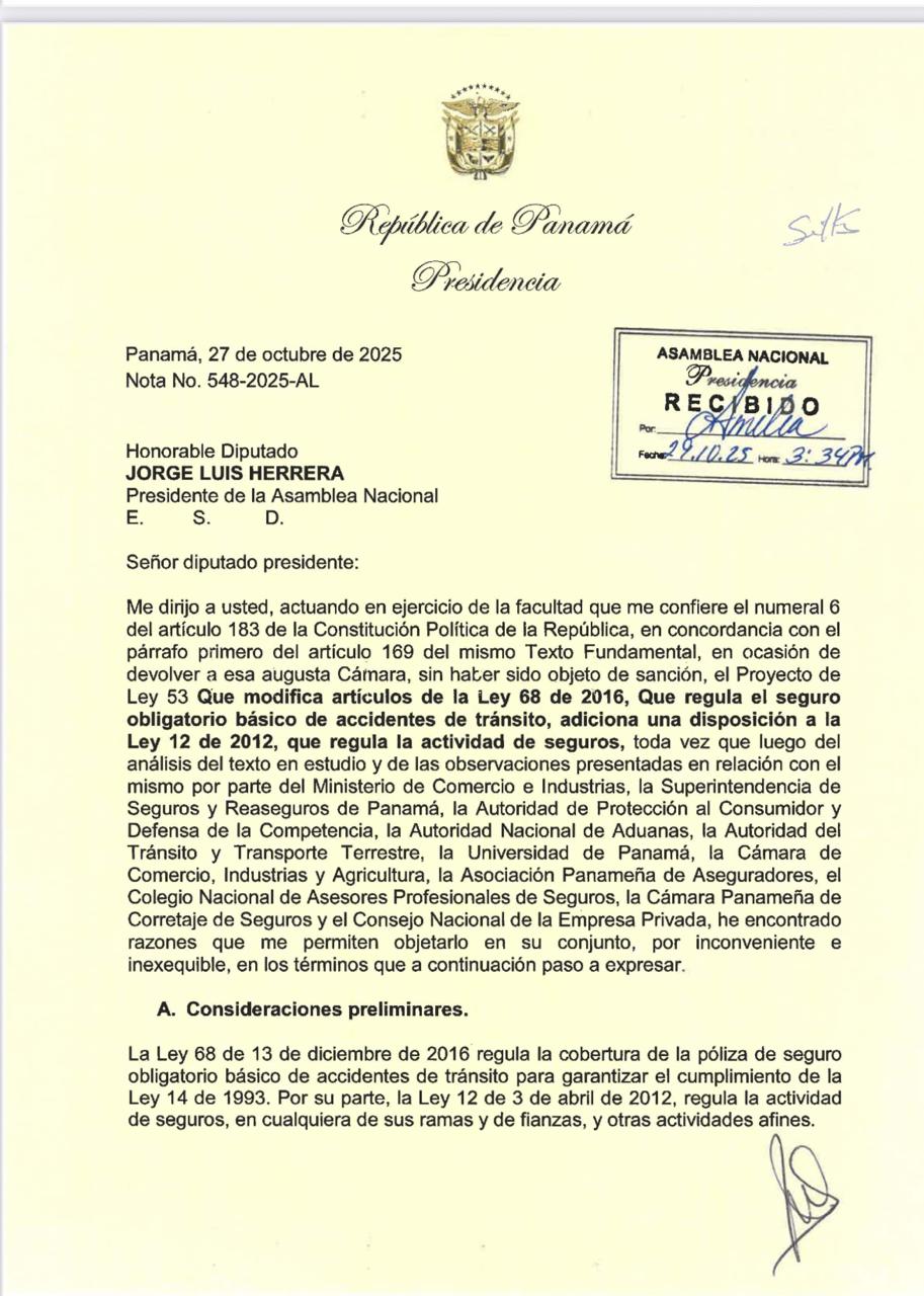 En la nota fechada el 27 de octubre y enviada al presidente de la Asamblea Nacional, Jorge Luis Herrera, el mandatario argumentó que la iniciativa, aunque pretendía beneficiar al consumidor, generaría efectos adversos en el sistema asegurador y en la economía en general, al imponer controles de precios sin sustento técnico.