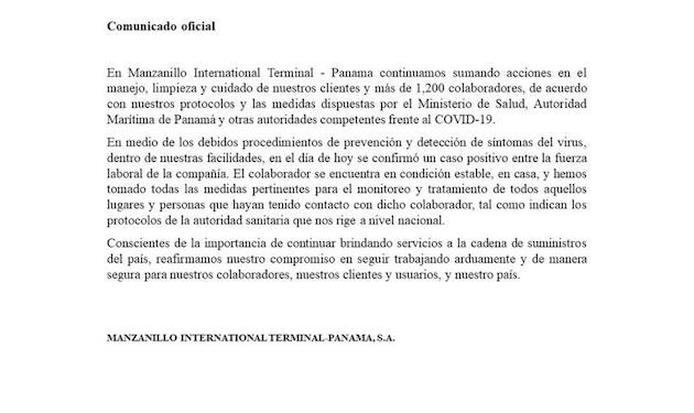 EL Puerto Manzanillo Internacional Terminal informó que en su fuerza laboral se dio un caso positivo de COVID 19, y que se siguieron los protocolos de salud del caso.